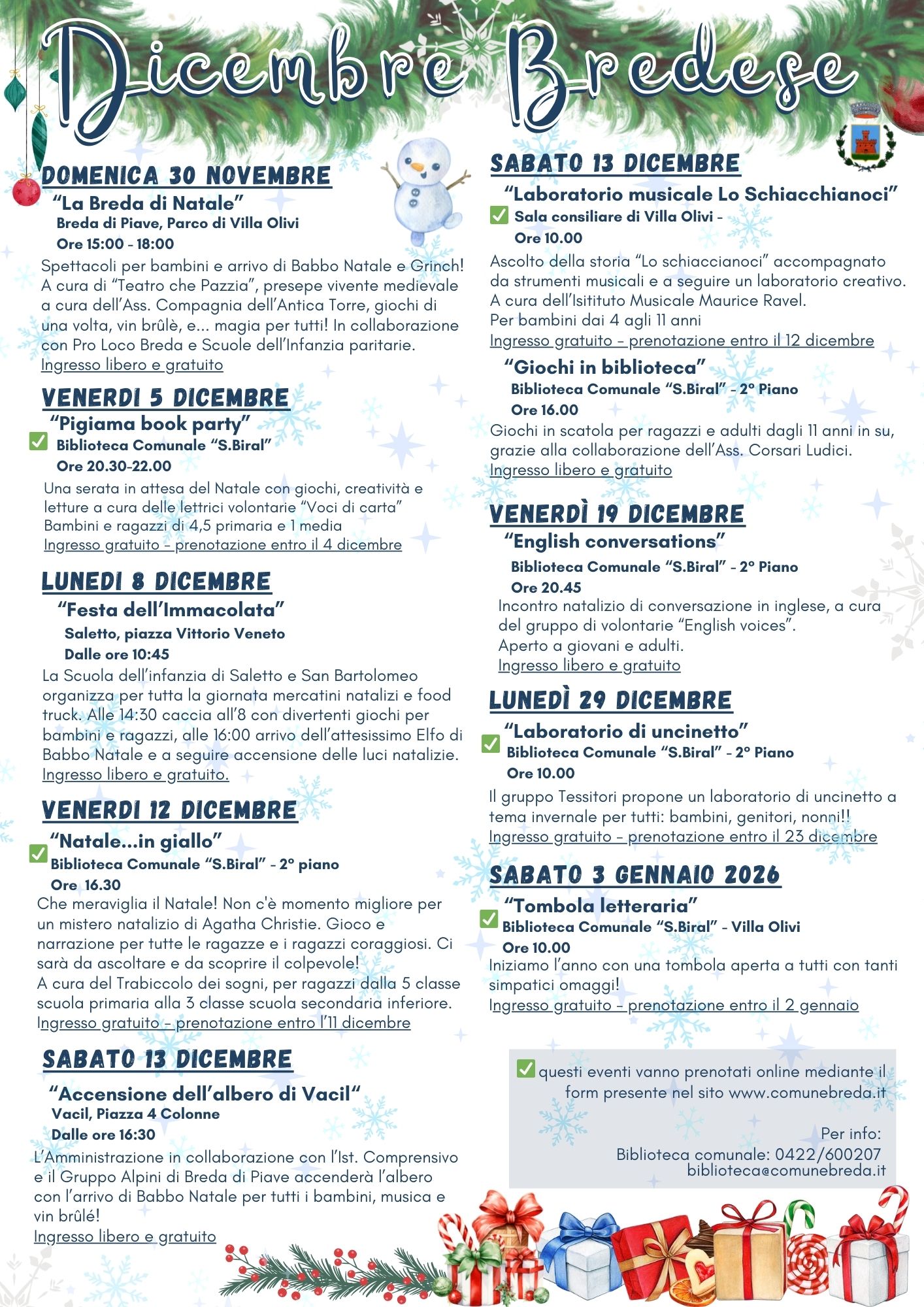 La biblioteca comunale, in collaborazione con i gruppi di volontari, organizza la rassegna "Dicembre bredese" con eventi per tutti.