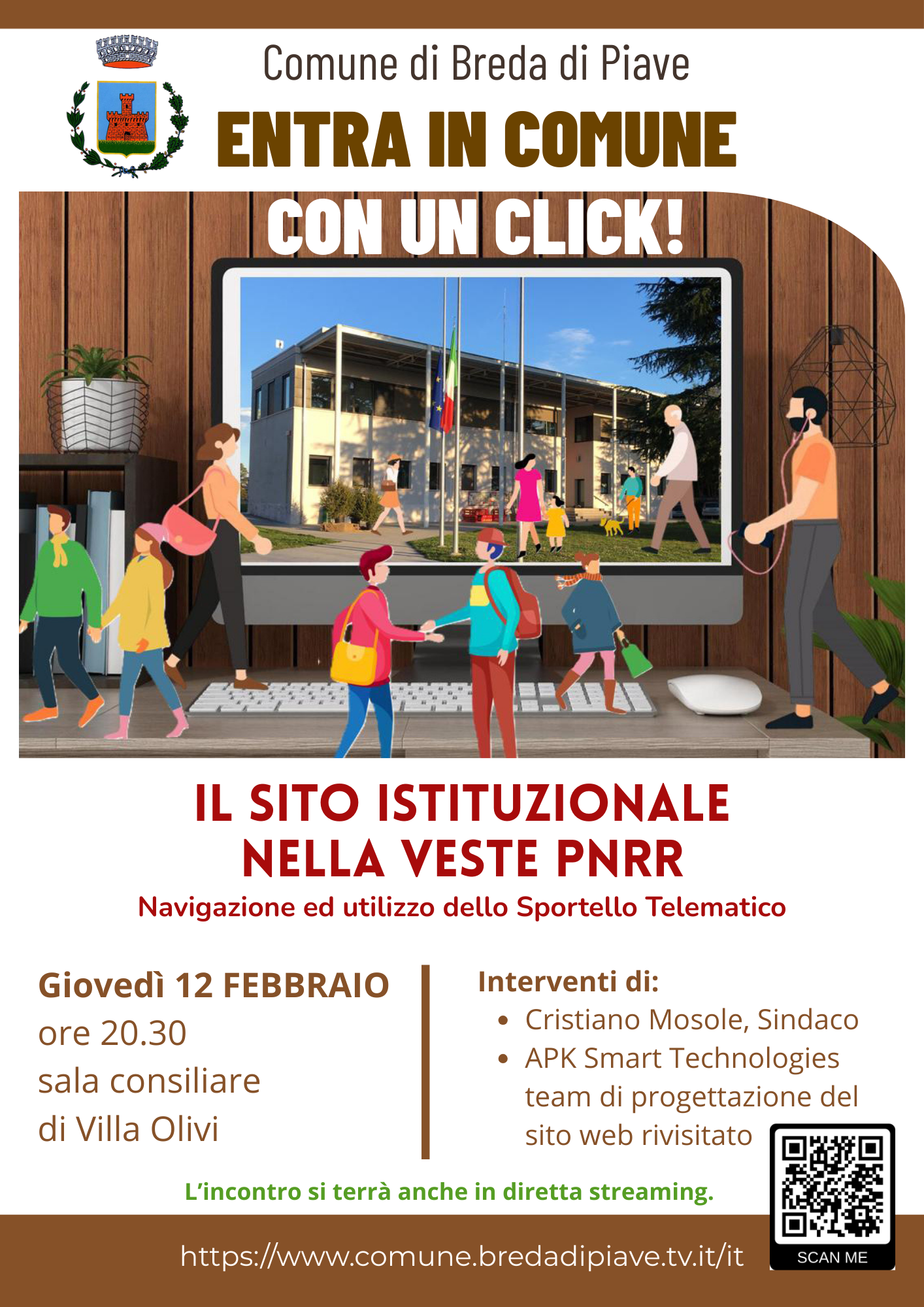 Giovedì 12 febbraio 2026, alle ore 20.30, si terrà in sala consiliare di Villa Olivi un incontro aperto al pubblico per conoscere meglio l’utilizzo e la consultazione del sito web e dello sportello telematico.